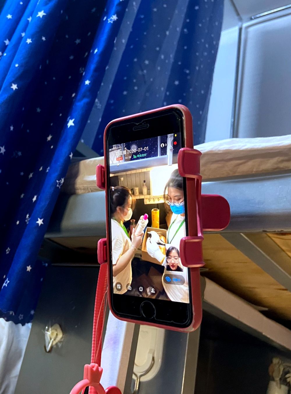 在北京理工大學一間女生宿舍里,設(shè)計與藝術(shù)學院的老師朱彥蒙,正對著手機與屏幕中的一位同學交流。手機用自拍桿架在宿舍床邊,視頻中的女孩是該學院畢業(yè)生孫嘉,身在遼寧家中。