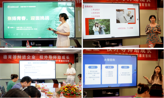 德育答辯環(huán)節(jié),每位學(xué)生依次上臺(tái),通過(guò)PPT展示的形式,從思想品德、理想信念、專(zhuān)業(yè)學(xué)習(xí)、人際交往、就業(yè)實(shí)習(xí)、社會(huì)實(shí)踐等多個(gè)角度對(duì)大學(xué)學(xué)習(xí)生活進(jìn)行總結(jié)和反思,陳述大學(xué)期間的收獲和成長(zhǎng),分享學(xué)習(xí)方法和經(jīng)驗(yàn),審視自己大學(xué)四年的成長(zhǎng)歷程、思想轉(zhuǎn)變以及對(duì)未來(lái)的美好憧憬。彭明雪、呂飛、郝麗姝、徐秋華、班主任孫士偉、輔導(dǎo)員王娟對(duì)同學(xué)們四年來(lái)的成長(zhǎng)進(jìn)步給予充分肯定,對(duì)存在的不足提出意見(jiàn)建議,并給予鼓勵(lì)和職業(yè)規(guī)劃指導(dǎo)。