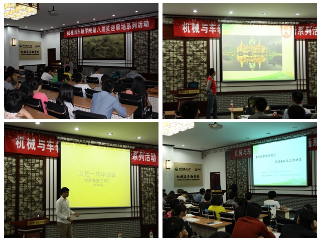 為了更好地指引、輔導(dǎo)畢業(yè)生擺正心態(tài),掌握就業(yè)技巧,找到滿意的職位;并針對(duì)高年級(jí)的本科生做好職業(yè)規(guī)劃指導(dǎo),針對(duì)有留學(xué)意向的同學(xué)做好出國(guó)前準(zhǔn)備工作的指引,本學(xué)期機(jī)械與車輛學(xué)院圍繞“職業(yè)生涯規(guī)劃指導(dǎo)”、“走出去、大未來(lái)——留學(xué)申請(qǐng)指導(dǎo)”、“求職技能大提升——簡(jiǎn)歷面試工作坊”三個(gè)主題開展,開展了一系列精彩紛呈的“笑迎職場(chǎng)”就業(yè)指導(dǎo)活動(dòng)。