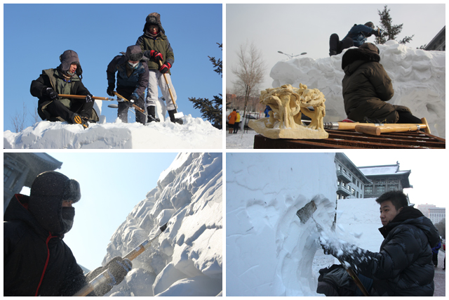 1月3日晚,大賽組委會(huì)舉行了簡(jiǎn)單的開幕儀式和雪塊抽簽環(huán)節(jié),1月4日上午8時(shí),大賽進(jìn)入正式比賽階段。1月的冰城寒風(fēng)凜冽,北理工雪雕隊(duì)冒著零下20度的嚴(yán)寒,克服了低溫、病痛、時(shí)間緊迫等不利因素,夜以繼日的奮戰(zhàn)在雪雕大賽最前線,將全部精力集中于作品的創(chuàng)作之中。團(tuán)隊(duì)如火的創(chuàng)作熱情,精湛的雕刻技藝成為了大賽中一道亮麗的風(fēng)景線。