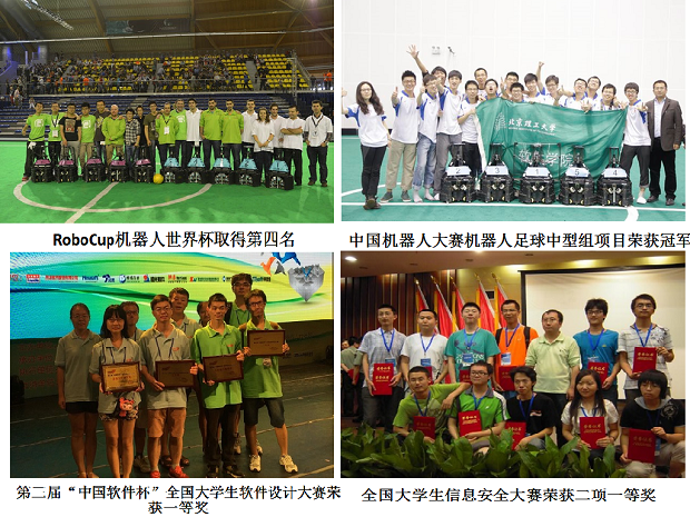 八年來,基地建設(shè)學(xué)生創(chuàng)新實踐專用場地近600平方米,投入專項經(jīng)費數(shù)百萬元,添置各類軟硬件設(shè)備百余套,組織學(xué)生積極參加國內(nèi)外各類創(chuàng)新實踐競賽,共獲得省部級以上科技競賽獎勵1557人次,其中國際級152人次、國家級1290人次、省部級115人次,先后包括國際機器博弈錦標(biāo)賽金牌、中國機器人大賽特等獎、全國信息安全大賽一等獎、全國“挑戰(zhàn)杯”大學(xué)生課外學(xué)術(shù)科技作品競賽一等獎、全國機器人大賽機器人足球中型組冠軍等重量級獎項。