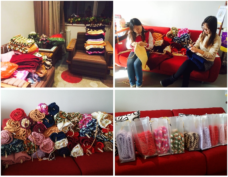 一個(gè)月后,一條條暖心圍脖陸續(xù)完成。失獨(dú)小組于12月16日開始進(jìn)行回收工作。同學(xué)們滿懷期待,將親手編織的“作品”交到心理與社會(huì)工作實(shí)驗(yàn)室來,更有熱心的同學(xué)完成了兩條甚至更多的圍脖。僅僅3天的時(shí)間,收到的圍脖便堆積成山,載滿了同學(xué)們?cè)诤涠罩腥紵臒崆榕c愛心。失獨(dú)小組成員們仔細(xì)將一條條即將完成的圍脖收針封口,整齊放置到一個(gè)個(gè)精心挑選的包裝袋中,將同學(xué)們的愛心以最美好的方式帶給新希望家園的老人們。