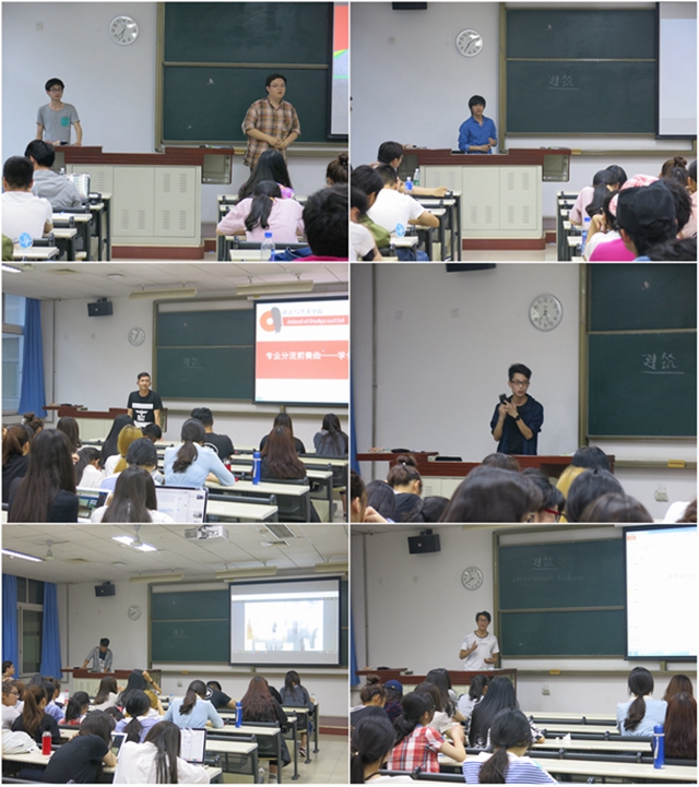 分享會籌備前期,學院借助微信公眾平臺對2015級學生進行了專業(yè)分流相關(guān)問題的征集,收到學生問題49個,經(jīng)學院整理編輯有效問題共計25個,內(nèi)容涵蓋專業(yè)細節(jié)、專業(yè)前景、教學管理三個方面。環(huán)境藝術(shù)專業(yè)的楊德加、蘆天玄、張博文三位同學分享了環(huán)境藝術(shù)系相關(guān)課程的學習經(jīng)驗及學習內(nèi)容。工業(yè)設(shè)計專業(yè)的陸炎凱、張寶文、張嚴三位同學結(jié)合親身經(jīng)歷,向?qū)W弟學妹分享學習心得,介紹所學專業(yè)對學生的能力要求以及相關(guān)就業(yè)方向。郭瀚澤同學介紹了視覺傳達專業(yè)的主要課程以及對手繪能力的要求,并分享了部分視覺傳達的優(yōu)秀作品。最后,文化遺產(chǎn)專業(yè)的朱彥蒙、林婷娟介紹了文遺專業(yè)與其他專業(yè)的區(qū)別,分享了專業(yè)學習心得并鼓勵大家多探索、勤思考。