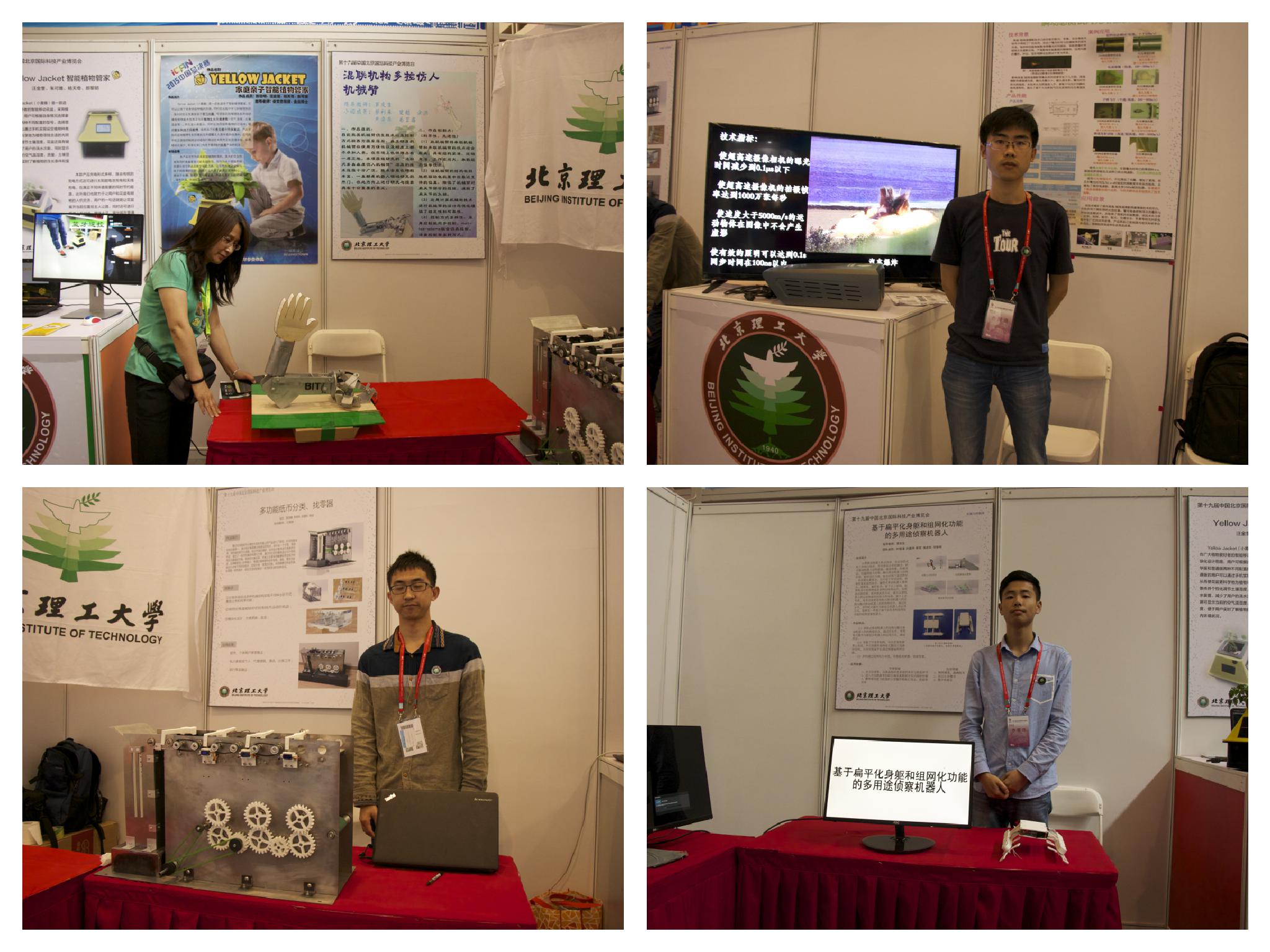 此次展覽總共持續(xù)了五天時間,期間同學們熱情飽滿。來參展的觀眾數(shù)量極大,同學熱心地為來觀者講解,也有不少商家前來詢問情況,尤其是“yellow jecket智能職務管家”項目憑借其精美性經濟性和實用性贏得了不少觀眾的駐足觀看,很多商家上前洽談了合作意向。能夠代表北京理工大學、代表北京地區(qū)高等院校參加本次展覽,是對機電學院相關指導教師長久以來堅持指導大學生科技創(chuàng)新項目、培養(yǎng)大學生創(chuàng)新能力成效的充分肯定,是對機電學院在組織開展和大力支持大學生科技創(chuàng)新項目相關工作的積極鼓勵。在此,也對長期以來給予學生科技創(chuàng)新以大力支持和眾多關懷的教務處、校團委等職能部門表示衷心感謝。