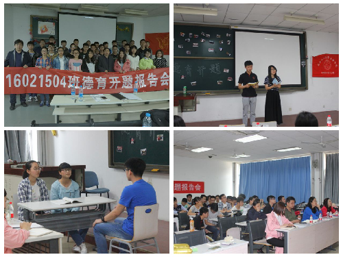 160211501班將答辯地點(diǎn)設(shè)在風(fēng)景宜人的北湖湖畔,接近大自然打開心扉,同學(xué)們結(jié)合《致青春》的讀書感受,總結(jié)了這一學(xué)期以來的得失,分享了個(gè)人感悟,并表達(dá)了對(duì)未來的憧憬。16021502班以《中國合伙人》影片為切入點(diǎn),每位同學(xué)結(jié)自身情況對(duì)大學(xué)的理想和目標(biāo)進(jìn)行了闡述與規(guī)劃。16021503班以同學(xué)們自導(dǎo)自演主題短劇作為線索,生動(dòng)展示了大學(xué)中從軍訓(xùn)、上課、考試、考研到就業(yè)時(shí)可能遇到的困難和挫折,成為德育開題答辯的一大亮點(diǎn),寓教于樂。16021504班以“家在心中,夢在遠(yuǎn)方”為主題,加入了“相知相守”自制視頻日志,紀(jì)錄了班級(jí)活動(dòng)的點(diǎn)點(diǎn)滴滴,營造了良好的氛圍。
