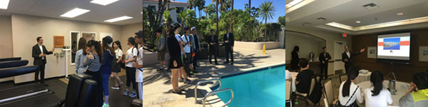 7月16日至22日,暑期項目參訓(xùn)團(tuán)隊于洛杉磯成功開展了校友企業(yè)參觀活動,全體參訓(xùn)學(xué)生對美國猶他州立大學(xué)校友Frank Yuan先生旗下Double Tree酒店(希爾頓酒店集團(tuán))進(jìn)行了訪問參觀。參觀學(xué)習(xí)活動得到了酒店管理層的高度重視,酒店總經(jīng)理Mike Powers先生、營銷總結(jié)Chen先生及客房服務(wù)總監(jiān)Elena Fu小姐為同學(xué)們詳細(xì)講授了酒店運(yùn)行中的實(shí)際情況,使同學(xué)們了解到經(jīng)濟(jì)學(xué)知識在實(shí)際企業(yè)運(yùn)營過程中的重要性。隨后酒店管理團(tuán)隊帶領(lǐng)同學(xué)們參觀了酒店整體及重點(diǎn)區(qū)域。