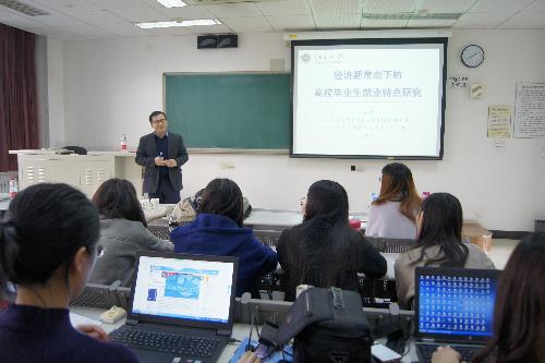 岳昌君教授圍繞“經(jīng)濟(jì)新常態(tài)下高校畢業(yè)生就業(yè)特點”,從宏觀經(jīng)濟(jì)背景、就業(yè)特點研究、教育質(zhì)量評價和就業(yè)趨勢分析四大方面做了詳細(xì)的講解。岳教授介紹了我國經(jīng)濟(jì)發(fā)展顯現(xiàn)出的新常態(tài),分析了經(jīng)濟(jì)發(fā)展階段與產(chǎn)業(yè)結(jié)構(gòu)的關(guān)系、與教育的關(guān)系,經(jīng)濟(jì)全球化時代需要全球化人才以及互聯(lián)網(wǎng)+時代高等教育改革的方向。他以北京大學(xué)教育學(xué)院承擔(dān)的“全國高校畢業(yè)生就業(yè)狀況”調(diào)查為例,從就業(yè)去向、就業(yè)落實率、就業(yè)分布、工作類型、起薪、總體滿意度、就業(yè)渠道、擇業(yè)意向、就業(yè)影響因素、就業(yè)流動等方面介紹了高校畢業(yè)生的就業(yè)特點。在高等教育質(zhì)量評價方面,岳教授從高校提供的學(xué)習(xí)條件和學(xué)生發(fā)展評價兩個角度做了全面的分析。最后,岳教授總結(jié)了當(dāng)前全球工作特點變化的趨勢,耐心解答了同學(xué)們提出的問題。