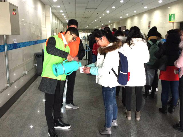 近期北京接連遭遇降雪、大風(fēng),招聘會當(dāng)天的最低氣溫已接近零下十度,出現(xiàn)極寒天氣。招生就業(yè)工作處專門安排大學(xué)生就業(yè)協(xié)會志愿者為參會學(xué)生提供飲用熱水和紙杯,還在保證現(xiàn)場秩序的情況下,安排參會學(xué)生在體育館內(nèi)排隊(duì)等候并提前入場應(yīng)聘。