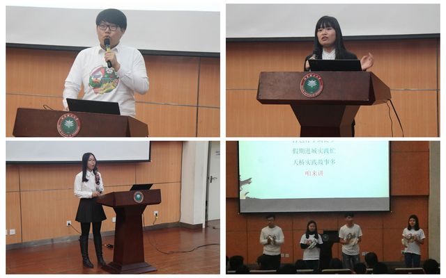 第十屆“天橋大學(xué)生主任助理實(shí)踐團(tuán)”團(tuán)員用幽默風(fēng)趣的三句半《大話天橋》展現(xiàn)出天橋街道豐富多彩的民俗文化與社會(huì)實(shí)踐經(jīng)歷;實(shí)踐團(tuán)團(tuán)長(zhǎng)肖劍橋進(jìn)行團(tuán)隊(duì)成果匯報(bào)和展示。2016年優(yōu)秀暑期社會(huì)實(shí)踐團(tuán)團(tuán)員代表王卉與劉敏通過(guò)分享自身暑期社會(huì)實(shí)踐經(jīng)驗(yàn),為同學(xué)們?cè)敿?xì)講解了社會(huì)實(shí)踐的具體過(guò)程與技巧方法。王悅同學(xué)以一首《最初的夢(mèng)想》表達(dá)出同學(xué)參與實(shí)踐、躬行求真的信念。