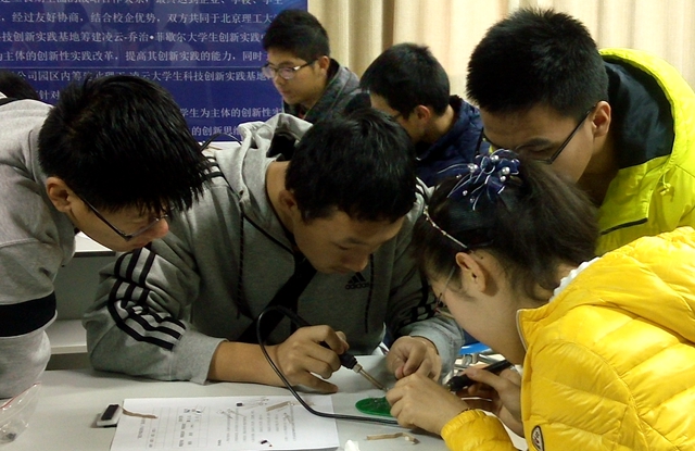 11月27號,科技活動月最終決賽“夜空中最亮的心”——流水燈焊接比賽終于在BIT科創(chuàng)大本營基地的機械加工坊和電子坊如期到來。在了解了制作流程后,選手們各個摩拳擦掌、蓄勢待發(fā)。讀說明、分電阻、焊電路,活動中隊員間相互配合,精益求精,并對各自作品進行了細致的調(diào)整。制作完成后,望著一盞盞 “心燈”亮起,科技活動月系列活動也步入了尾聲。