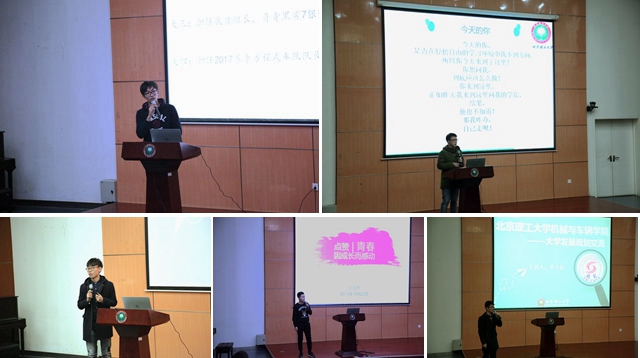 主論壇及開幕式于12月12日在良鄉(xiāng)校區(qū)綜合教學樓報告廳舉行,報告廳內(nèi)座無虛席?;顒友垉?yōu)秀科創(chuàng)車隊代表李桐、徐特立獎學金獲得者李小松、學生干部代表宋洛、青春榜樣孫嘉偉以及學習優(yōu)秀代表任棚等五位學生代表分享各自的大學生活。從不同角度鼓勵低年級學生樹立自信心,合理自我定位、做好規(guī)劃,積極主動地挖掘和利用校內(nèi)外資源與平臺,全面促進、提升個人的成長與發(fā)展。