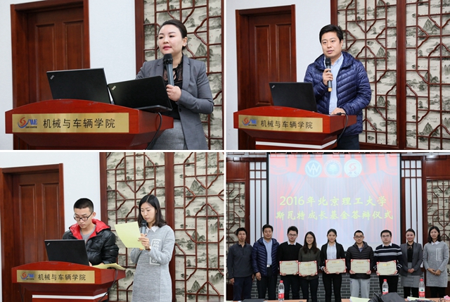 2016年12月15日,北京理工大學(xué)斯瓦特成長(zhǎng)基金答辯儀式在中關(guān)村校區(qū)車重報(bào)告廳隆重舉行。本次答辯邀請(qǐng)到了沈陽(yáng)斯瓦特汽車零部件有限公司總經(jīng)理助理鄭宇,機(jī)械與車輛學(xué)院黨委副書記副院長(zhǎng)范文輝,機(jī)械與車輛學(xué)院發(fā)動(dòng)機(jī)研究所副教授郝利君,機(jī)械與車輛學(xué)院團(tuán)委書記郝佳馨,機(jī)械與車輛學(xué)院研工委書記韓陽(yáng),機(jī)械與車輛學(xué)院機(jī)械創(chuàng)新創(chuàng)業(yè)中心主任張雨甜,機(jī)械與車輛學(xué)院分團(tuán)委副書記程繼超及100余名師生代表參加了本次活動(dòng),學(xué)院分團(tuán)委副書記李超主持了本次答辯儀式?!八雇咛爻砷L(zhǎng)基金”由斯瓦特汽車零部件有限公司設(shè)立,旨在促進(jìn)我國(guó)高等教育事業(yè)的發(fā)展,鼓勵(lì)在校學(xué)生科技實(shí)踐創(chuàng)新,團(tuán)結(jié)協(xié)作,努力學(xué)習(xí),刻苦鉆研,奮發(fā)向上,為學(xué)生成長(zhǎng)成才提供平臺(tái),培養(yǎng)和造就創(chuàng)新型人才。斯瓦特成長(zhǎng)基金自2015年簽約以來(lái),今年是首次評(píng)選,共評(píng)出了5名獲獎(jiǎng)學(xué)生,每人獎(jiǎng)勵(lì)12000元。