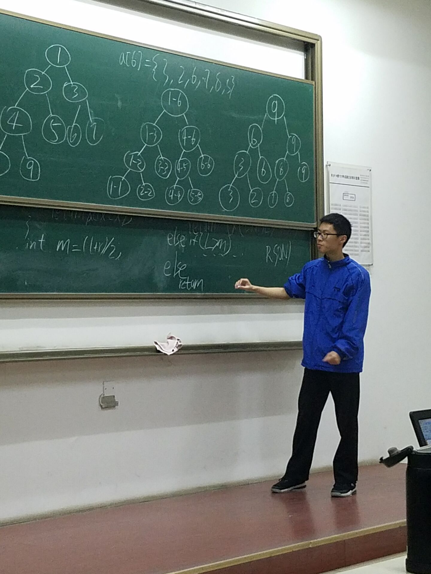 第二周培訓(xùn)由基地算法實(shí)驗(yàn)室2015級成員李東同學(xué)開展基礎(chǔ)培訓(xùn),講解深度優(yōu)先搜索;李宇輝同學(xué)開展進(jìn)階培訓(xùn),講解線段樹算法。2016級優(yōu)秀學(xué)生韓有方輔助學(xué)長,詳細(xì)講解和點(diǎn)評上一周的練習(xí)題目。李東同學(xué)從一個(gè)簡單的路徑搜索入手,展示了這種搜索策略的大體思想,在臺下同學(xué)理解這種思想之后,又將深度優(yōu)先搜索拓展到了更廣闊的應(yīng)用范圍里,同時(shí)以“八皇后”問題為例引入回溯法這一重要編程思想。臨下課時(shí),李東同學(xué)鼓勵大家多實(shí)踐,多在紙上模擬并體會深度優(yōu)先搜索的算法流程。在接下來的一個(gè)小時(shí)里,李宇輝同學(xué)帶來本學(xué)期第一次進(jìn)階培訓(xùn)——線段樹的講解。李宇輝同學(xué)詳細(xì)闡述了線段樹的組織結(jié)構(gòu)、時(shí)間優(yōu)勢、內(nèi)存占用等問題,每當(dāng)臺下同學(xué)們面露難色時(shí)就停下并留給大家一定的思考時(shí)間。課后,李宇輝同學(xué)解答了同學(xué)們的一些疑惑,并再次強(qiáng)調(diào)要多思考、多畫圖來理解這一數(shù)據(jù)結(jié)構(gòu)。