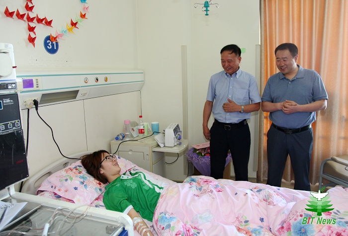 2017年5月24日,北京理工大學(xué)第六例造血干細(xì)胞捐獻(xiàn)者、機電學(xué)院2014級本科生張帆在海軍總醫(yī)院接受造血干細(xì)胞采集,隨著造血干細(xì)胞懸液從張帆身體里緩緩抽出,一次延續(xù)生命的接力就此展開。北京理工大學(xué)副校長王曉鋒一行帶著全校師生的祝福,前往醫(yī)院慰問正在接受造血干細(xì)胞采集的張帆。