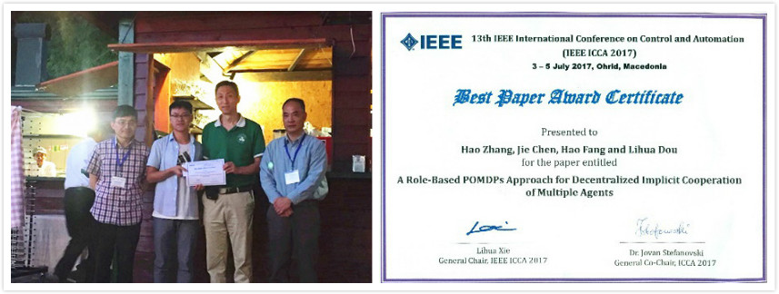 編輯:金林劍 審核:金軍 閱讀次數(shù):2017年7月3日至6日,在馬其頓共和國舉辦的The 13th IEEE International Conference on Control and Automation (IEEE ICCA 2017)國際學(xué)術(shù)會議中,北京理工大學(xué)自動化學(xué)院張浩、陳杰、方浩等的論文“A Role-based POMDPs Approach for Decentralized Implicit Cooperation of Multiple Agents”獲得大會的Best Paper獎。