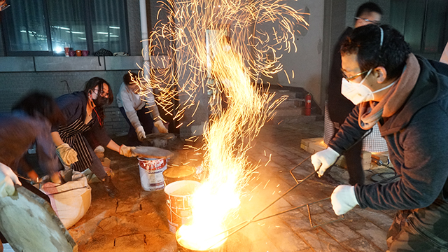 “出窯啦!”伴隨著幾聲歡呼,一個個剛剛?cè)廴诘奶账囎髌?,被從窯中夾出,放入裝有可燃物的鐵桶中時,頓時煙火翻騰,釉色金燦,給人一種美輪美奐的感覺,火焰升騰的畫面,令圍觀的學(xué)生們激情澎湃,無比欣喜。以上一幕并不是發(fā)生在遙遠的瓷都或者陶鄉(xiāng),而就發(fā)生在北京理工大學(xué)良鄉(xiāng)校區(qū)理學(xué)樓東側(cè)一隅,這里矗立起一座不大的陶窯,在這個名為“樂燒workshop”的課程里,北理工學(xué)子在老師帶領(lǐng)下,親自燒制自己設(shè)計的陶藝作品。