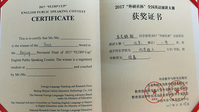北京理工大學(xué)選手喜獲“外研社”杯英語演講比賽一等獎(jiǎng)