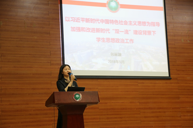 包麗穎以《以習(xí)近平新時代中國特色社會主義思想為指導(dǎo)加強和改進(jìn)新時代“雙一流”建設(shè)背景下學(xué)生思想政治工作》為題作專題報告。包麗穎強調(diào),新的時代背景下黨對高校辦學(xué)育人提出了新要求,新時代學(xué)生思想政治工作要以習(xí)近平新時代中國特色社會主義思想、習(xí)近平教育思想和全國高校思想政治工作會議精神為開展依據(jù)。關(guān)于新時代學(xué)生思想政治工作基本思路,一要聚焦根本性、基礎(chǔ)性問題,注重內(nèi)涵建設(shè)、內(nèi)涵發(fā)展,強化政治意識、質(zhì)量意識;二要堅持“繼承發(fā)揚與開拓創(chuàng)新相結(jié)合,系統(tǒng)推進(jìn)與重點突破相結(jié)合,資源整合與全員育人相結(jié)合,學(xué)生受益與學(xué)校發(fā)展相結(jié)合”;三要圍繞立德樹人根本任務(wù),鞏固深化全員全過程全方位育人格局;四要構(gòu)建思想深度、工作力度、情感溫度、成果效度有機統(tǒng)一的新時代思想政治工作體系;五要以務(wù)實管用的思想引領(lǐng)、價值塑造、成長服務(wù)為領(lǐng)軍領(lǐng)導(dǎo)人才培養(yǎng)打好堅實基礎(chǔ)。