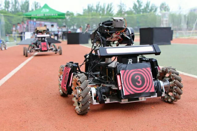 比賽采用紅、藍雙方對抗的形式,參賽隊伍通過自行設計制造多種機器人進行射擊對抗。參賽隊員需要遙控可以發(fā)射“彈丸”的手動機器人在復雜的場地中移動并發(fā)射“彈丸”,攻擊對方機器人和基地,擊毀敵方機器人方為獲勝。