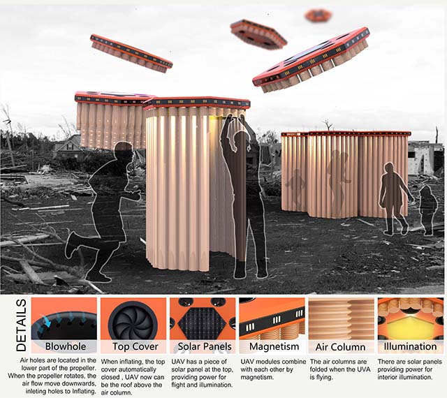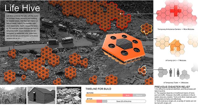 “LIFE HIVE”(蜂巢救災無人機系統(tǒng))的設計靈感來源于對災區(qū)救災過程的思考和人文關懷。Life Hive創(chuàng)新的將無人機應用于建筑方面,利用模塊化無人機靈活的飛行優(yōu)勢,搭載能力實現災區(qū)帳篷的快速搭建,有效提高救災質量。傳統(tǒng)的救災方式中,災區(qū)的帳篷的補給依賴于傳統(tǒng)的運輸工具以及路況。但災區(qū)的路況惡劣且十分不穩(wěn)定,帳篷經常得不到及時有效的供給。同時傳統(tǒng)的帳篷搭建較為繁瑣,耗時較長。同時傳統(tǒng)的帳篷均為大通鋪的形式,無法實現對個人隱私的尊重。此外,傳統(tǒng)的帳篷的設計采用單體的設計想法,并不能滿足如醫(yī)療站、廁所、家庭居住等不同大小、功能的空間需求。