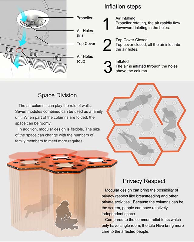 “LIFE HIVE”(蜂巢救災無人機系統(tǒng))模塊化的設計使得帳篷在搭建的過程當中,可以實現不同的需求,使得救災過程更加的合理衛(wèi)生。例如三個模塊即可組成臨時的公廁,七個模塊即可組成家庭居住單元,更多的模塊則可以搭建成醫(yī)療救護中心等等。
