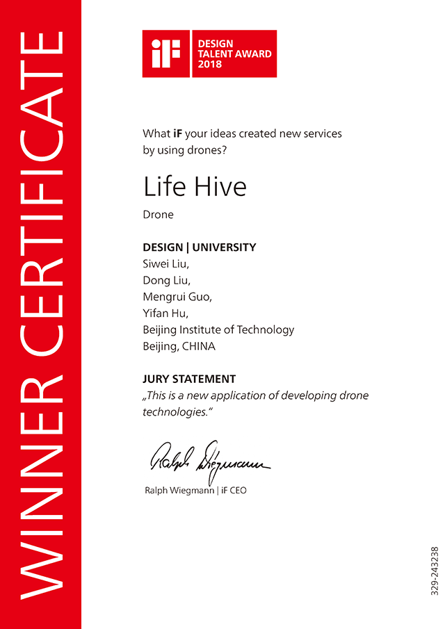 iF新秀設計大獎(IF TALENT AWARD)的評選聚焦于當前最重要的社會議題,收集有可能改變世界的創(chuàng)新想法,致力于尋找引領未來產品設計方向。 北理工設計學院郭萌睿、劉思維、劉冬、胡一帆四名同學的設計作品“LIFE HIVE”(蜂巢救災無人機系統(tǒng))參與了四個類型分組中的“新無人機服務”項目角逐,該項目要求探索發(fā)現無人機的新服務項目。作品要在“創(chuàng)新與精致”“美感”“責任”“功能”和“定位”五個方面都具有杰出的表現,才能獲得該獎項。