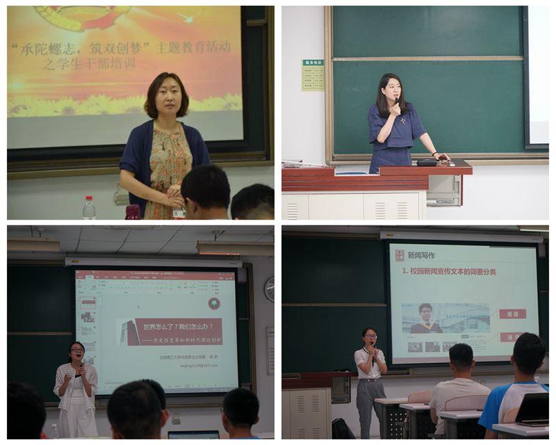 馬克思學(xué)院教師李京講授了“世界怎么了?我們?cè)趺崔k?——?dú)v史性變革和新時(shí)代理論創(chuàng)新”,從全球視野的角度,向全體參訓(xùn)學(xué)生解析了習(xí)近平新時(shí)代中國(guó)特色社會(huì)主義思想。她指出,作為新時(shí)代新青年,當(dāng)代大學(xué)生應(yīng)該不斷學(xué)習(xí)、獨(dú)立思考、自主選擇、鍛造逆商,承擔(dān)應(yīng)有的歷史擔(dān)當(dāng)。自動(dòng)化學(xué)院輔導(dǎo)員金林劍、向玉蘭指導(dǎo)參訓(xùn)學(xué)生集體學(xué)習(xí)了習(xí)近平總書記同團(tuán)中央新一屆領(lǐng)導(dǎo)班子成員集體講話精神、《不辱時(shí)代使命,不負(fù)人民期望-習(xí)近平總書記對(duì)青年學(xué)子的寄語》《在新時(shí)代征程中砥礪前行》共青團(tuán)改革綜述等內(nèi)容。物理學(xué)院副書記副院長(zhǎng)王晶晶講授了學(xué)生心理健康的專題講座,她運(yùn)用薩提亞冰山模型,教育學(xué)生正確認(rèn)識(shí)自我,并關(guān)注大學(xué)生心理健康教育。黨委宣傳部韓姍杉作題為《做好校園新聞報(bào)道的三把鑰匙》的授課,從新聞寫作、新聞攝影和新媒體運(yùn)營(yíng)三個(gè)方面,為學(xué)生干部講授了新媒體運(yùn)營(yíng)的工作技巧和注意事項(xiàng)。機(jī)電學(xué)院團(tuán)委書記于滿作“樹立服務(wù)意識(shí),培養(yǎng)大局觀念”的講座,她強(qiáng)調(diào),學(xué)生干部要“三思而后行”,有自己的思考,不能人云亦云,也分享了與老師同學(xué)溝通的技巧,從禮儀規(guī)范、氣質(zhì)胸懷和文化品位等方面教導(dǎo)學(xué)生干部提升個(gè)人素質(zhì),做一個(gè)好干部。