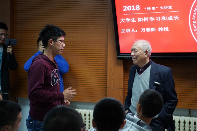 已經(jīng)85歲高齡的萬春熙教授在歷時近2個小時的講座交流全程一直保持著矍鑠的精神,工作人員幾次請他坐下休息但都被婉言拒絕。深厚的理論功底、廣博的知識儲備、形象的語言表達,尤其是他對教育事業(yè)的赤誠和對青年學子成長成才由衷的期冀,深深的感染著在場的每一名師生。他表示,能與青年學子有這樣近距離的面對面交流,也是他的快樂之道,他愿和大家一路,在人生的大學里繼續(xù)努力學習,與青年學子成為同學。