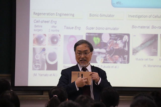 福田敏男院士的講座內(nèi)容豐富,生動活潑。他圍繞機(jī)器人系統(tǒng)的設(shè)計與控制進(jìn)行了細(xì)致講解,并結(jié)合大量視頻,為大家展示了機(jī)器人領(lǐng)域最前沿的科研成果。報告中還著重介紹了微納機(jī)器人的原理、關(guān)鍵技術(shù)、發(fā)展現(xiàn)狀以及未來在生物、醫(yī)學(xué)等領(lǐng)域的廣闊應(yīng)用前景,多數(shù)成果都來自福田敏男院士本人的實驗室,因而他對此如數(shù)家珍,深入淺出的講解引起同學(xué)們陣陣共鳴。