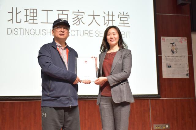 講座最后,包麗穎向江雷院士頒發(fā)了北京理工大學(xué)“百家大講堂”紀(jì)念證書并贈(zèng)送了鐫刻有北理工學(xué)生為江雷院士創(chuàng)作的《踏莎行?贈(zèng)江雷院士》的竹簡(jiǎn)作為紀(jì)念。