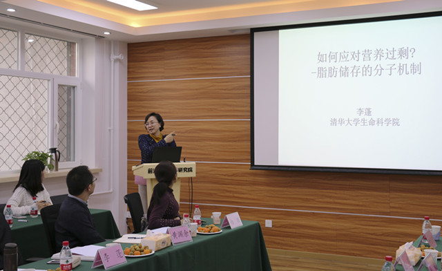 李蓬院士作了題為《如何應(yīng)對營養(yǎng)過剩-脂肪儲存的分子機(jī)制》的報(bào)告。報(bào)告中她提出,脂類物質(zhì)包括脂肪、磷脂、膽固醇等參與膜結(jié)構(gòu)和能量代謝的重要分子。中性脂肪甘油三酯(TAG)是細(xì)胞內(nèi)能量的主要來源。在食物充足的條件下,攝入的能量以脂肪的方式儲存于脂肪組織中。脂肪主要儲存于脂滴中,脂滴作為能量儲存的細(xì)胞器,在細(xì)胞脂穩(wěn)態(tài)調(diào)控中起重要作用。CIDE 家族蛋白是脂滴和內(nèi)質(zhì)網(wǎng)結(jié)合蛋白,可調(diào)節(jié)脂肪細(xì)胞,肝臟細(xì)胞,皮脂細(xì)胞和乳腺細(xì)胞等多種細(xì)胞中脂肪的儲存,分泌,降解等多個(gè)過程。在分子機(jī)制上,CIDE家族蛋白可在脂滴與脂滴結(jié)合處富集,形成類似孔狀的結(jié)構(gòu),促進(jìn)脂滴間脂的流動(dòng),通過脂滴之間的壓力差,引起小脂滴的脂肪定向向大脂滴流動(dòng),最終導(dǎo)致脂滴的融合和生長。調(diào)節(jié)脂滴融合的蛋白,如Perlipin1,Rab18和AS160 等可通過與CIDE的相互作用調(diào)節(jié)脂滴融合的速度和效率;脂肪酸可通過正反饋調(diào)節(jié)脂滴的融合和脂肪的儲存。研究發(fā)現(xiàn)了調(diào)控脂肪儲存和代謝性疾病發(fā)生的一條新途徑。
