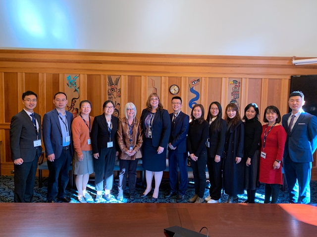 步入不列顛哥倫比亞省議會(huì)大廈,帥氣專業(yè)的解說員用其夸張而有趣的腔調(diào)為我們?nèi)婕?xì)致地介紹了議會(huì)大廈的歷史及加拿大的政治體制。之后議會(huì)議員和人力資源廳常務(wù)副廳長友好的接見了訪學(xué)團(tuán)。加拿大是多黨執(zhí)政國家,每屆4年,為更好地獲得民眾支持,議會(huì)政府會(huì)不遺余力為民眾創(chuàng)造獲得感,比如為各行各業(yè)制定完善的培訓(xùn)體系,讓每個(gè)人都能獲得專業(yè)培訓(xùn)、就業(yè)的機(jī)會(huì)等。