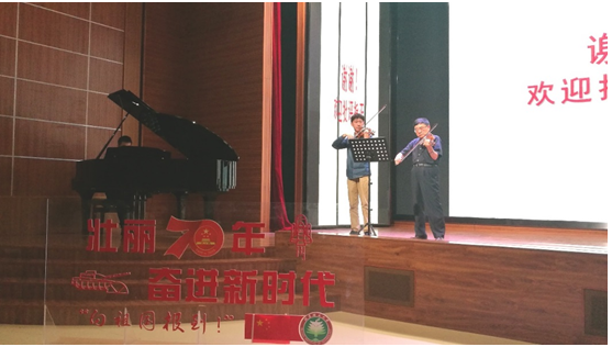 在專家互動環(huán)節(jié),葉志明教授精心為學(xué)生現(xiàn)場演奏了小提琴二重奏《我和我的祖國》,展示了理工科專家的藝術(shù)素養(yǎng)和情懷,校大學(xué)生鋼琴團(tuán)肖子尋、交響團(tuán)張云天參與了演奏,共同獻(xiàn)禮70周年國慶。
