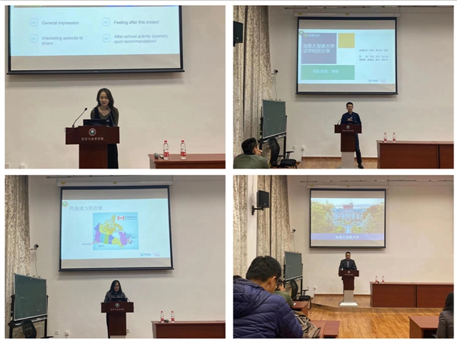 10月19日,管理與經(jīng)濟(jì)學(xué)院李京副教授、李艷副教授,加拿大皇家大學(xué)駐中國(guó)區(qū)首席代表房震老師,赴瑞士交流學(xué)生代表張玉萌,赴加拿大交流學(xué)生代表高中濤應(yīng)邀為專業(yè)學(xué)位項(xiàng)目的同學(xué)們做了游學(xué)分享。在分享會(huì)上,老師和同學(xué)們從不同的切入點(diǎn),生動(dòng)詳盡地講解了中瑞?。–IS)項(xiàng)目及加拿大皇家大學(xué)訪學(xué)項(xiàng)目的情況,分享各自的收獲和感悟。