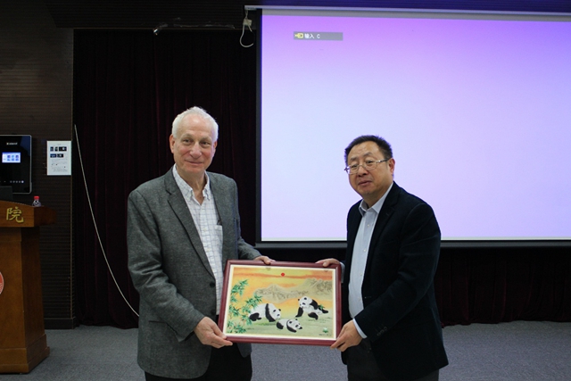 報(bào)告結(jié)束后,方岱寧院士為Needleman教授頒發(fā)了北理工“百家大講堂”的授課證書(shū),同時(shí)送上了象征著友好、和平和團(tuán)結(jié)的熊貓刺繡,表達(dá)了對(duì)Needleman教授的感謝以及和Needleman教授合作的期望。