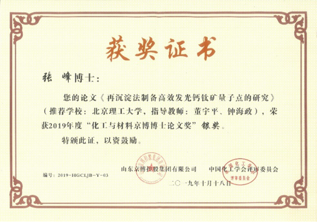 10月17日至20日,2019中國化工學(xué)會年會在濱海城市山東青島召開。在此會議上,2019年度化工與材料京博博士論文獎舉行了頒獎儀式,材料學(xué)院2018屆博士畢業(yè)生張峰斬獲銀獎,為北京理工大學(xué)材料學(xué)院在學(xué)會優(yōu)博的榮譽榜上增添了亮麗的一筆。本次所獲銀獎的博士論文題目是“再沉淀法制備高效發(fā)光鈣鈦礦量子點的研究”,指導(dǎo)教師是董宇平教授和鐘海政教授。