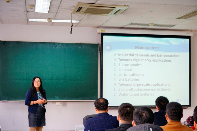 在這次演講中,郭再萍教授詳細(xì)介紹了她的研究團(tuán)隊近幾年在金屬離子電池的先進(jìn)電極材料領(lǐng)域的最新成果,闡述了在合成不同類型的混合納米結(jié)構(gòu)電極材料以提高金屬離子電池的電化學(xué)儲能性能方面的一些最新進(jìn)展。報告的互動交流環(huán)節(jié),郭再萍教授還就中子輻射測試和紅外顯微成像等問題與在場師生進(jìn)行了討論和交流。