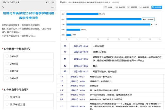 2月4日,根據(jù)學校疫情防控總體安排,學校決定延期開學不停課,教師按原上課時間通過網(wǎng)絡教學授課。機械與車輛學院第一時間成立由學院院長、黨委書記擔任組長的網(wǎng)絡教學保障組,吹響了這場“網(wǎng)絡教學戰(zhàn)役”的集結號。1-4周內(nèi)96位授課教師,117個教學班,覆蓋7666名學生,面對艱巨的網(wǎng)絡教學任務,學院充分借助專業(yè)和研究所基層教學組織,緊密依靠教師,多次召開聯(lián)席會議,及時傳達學校要求,加強部署和聯(lián)動,將所有教師的思想統(tǒng)一到學校的大局工作中。學院相繼開展了“明標準、搭平臺、建渠道、塑模式、享資源、勤督查、重反饋、保服務”八項工作,全力準備迎接開學第一課。