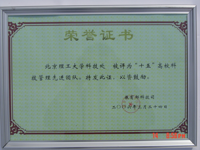 科技處全體成員以國家利益為重,積極響應(yīng)國家科技、國防和經(jīng)濟建設(shè)的需要,構(gòu)建科技創(chuàng)新體系,規(guī)劃科研發(fā)展方向,組織各類項目申報,嚴(yán)格合同過程管理,鼓勵成果鑒定報獎,推動成果轉(zhuǎn)讓轉(zhuǎn)化,保護(hù)學(xué)校知識產(chǎn)權(quán),維護(hù)國家學(xué)校利益,在科技管理工作中業(yè)績突出,受到教育部科技司的表彰。