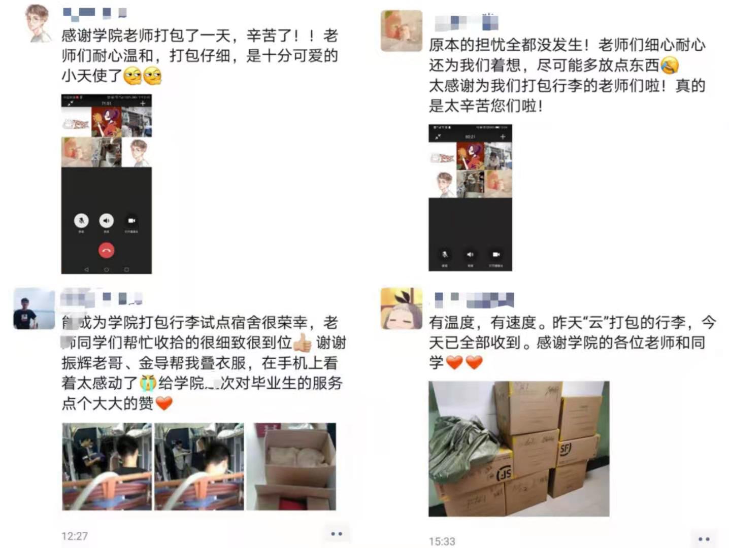 “云打包”中的感人畫面讓畢業(yè)生們發(fā)出感嘆:“老師們耐心溫和,打包仔細,是十分可愛的小天使了”;“原本的擔憂全都沒發(fā)生!老師們細心耐心還為我們著想,盡可能多放點東西”;“有溫度,有速度。昨天打包的行李今天就全部收到啦”……畢業(yè)生們的真情流露傳遞著溫暖,更傳遞了對母校和母院的愛。