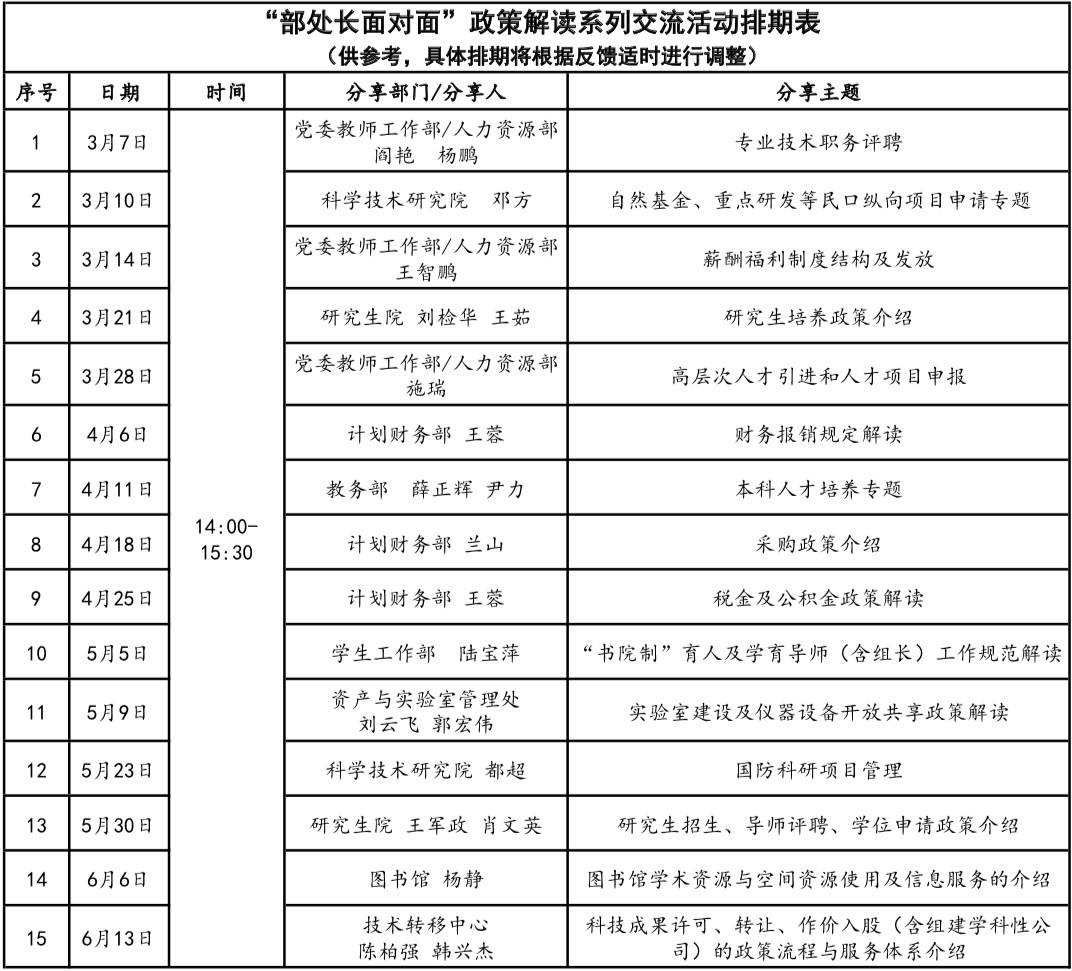 延伸了解:“部處長面對面”政策解讀交流系列活動是由教師發(fā)展中心組織,學校管理部門參與、面向全校教職工開展的座談交流活動。系列交流活動將從3月持續(xù)到6月,活動將邀請黨委教師工作部/人力資源部、學生工作部、教務部、研究生院、計劃財務部、科學技術研究院、資產與實驗室管理處、圖書館、技術轉移中心等部門,對相關政策制度進行解讀,并與教職工進行具體溝通交流。