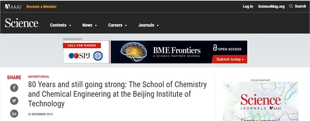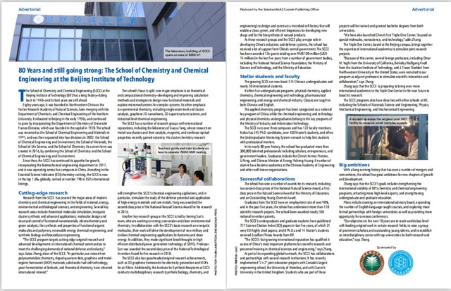11月22日,《Science》在其Advertorials欄目專題報道了北理工化學與化工學院發(fā)展建設(shè),詳細介紹了學院的學科布局與發(fā)展、科學研究、國際化建設(shè),并對2016年榮獲國家自然科學二等獎的楊國昱教授團隊、2018年榮獲國家技術(shù)發(fā)明二等獎的孫克寧教授團隊,以及他們分別所聚焦的多金屬氧簇研究、能源轉(zhuǎn)換和綠色化學研究等進行了重點報道。此外,文章稱,化學與化工學院將在已有的平臺建設(shè)、師資隊伍建設(shè)以及人才培養(yǎng)基礎(chǔ)上,進一步與學校的“雙一流”建設(shè)相結(jié)合,加強化學與化工兩個學科的融合發(fā)展,利用省部級國際交流平臺提升學科的國際化建設(shè)水平。