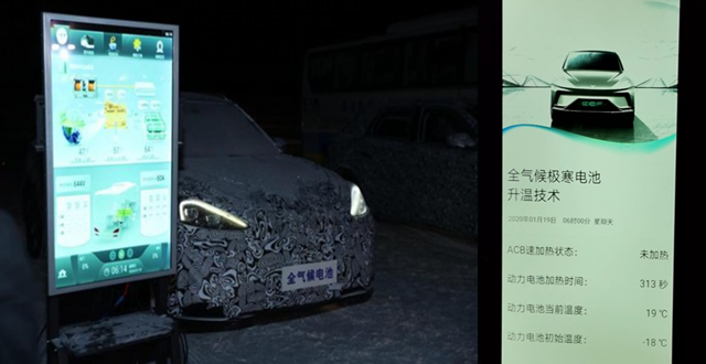 本次極寒測試是2017年以來的第三次,也是針對整體極寒技術(shù)群進行的“收官”測試。測試現(xiàn)場,北汽新能源的2輛純電動乘用車、北汽福田的2輛純電動客車針對車輛在極寒環(huán)境下,動力電池無法進行正常充放電的問題,現(xiàn)場進行了電池溫升試驗。所有測試車輛在-30℃的環(huán)境下,放置超過48小時后,進行了超低溫冷啟動測試和超低溫熱泵空調(diào)測試。現(xiàn)場通過連接測試車輛的大屏幕觀測到了動力電池電芯溫度由-18℃,以7℃/min的速度,在很短時間內(nèi)迅速升溫至零度以上,并成功進行了啟動,相比2019年升溫速度提升40%以上。同時,試驗車輛搭載的補氣增焓熱泵空調(diào)也正常平穩(wěn)運行,現(xiàn)場測試取得圓滿成功。