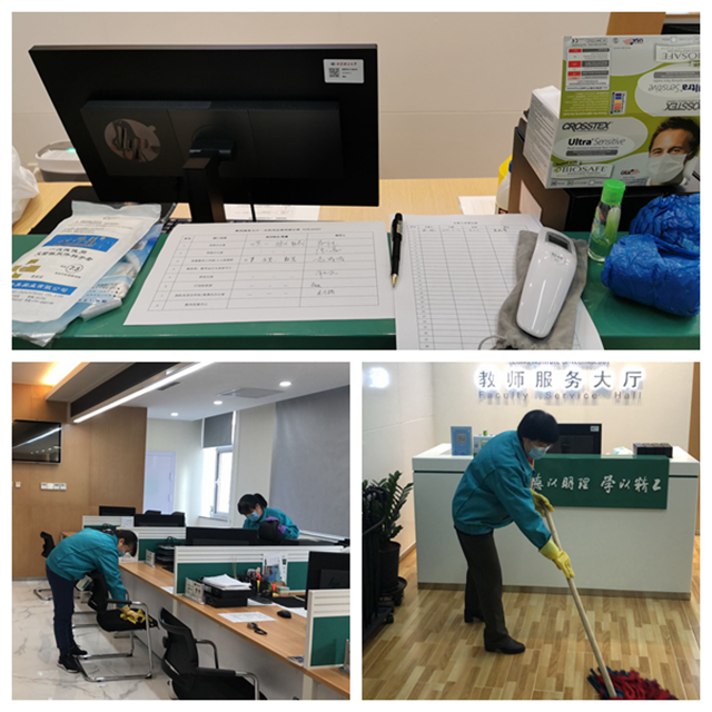 春節(jié)后,大廳恢復開放前一天,物業(yè)保潔人員進行了全面清潔和消毒工作,開放期間每天也將進行至少兩次消毒;為加強值班人員個人防護,中心每天向每位工作人員發(fā)放口罩、一次性手套、鞋套等防護物資,做好體溫檢測和登記;中心要求辦事教職工必須正確佩戴口罩,并做好體溫檢測、人員身份認證和登記工作。通過全方位防控,有力保障全體工作人員和辦事人員的健康和安全。