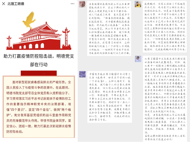“作為學(xué)生黨員,我們要時刻牢記使命,樹立起服務(wù)同學(xué)、聯(lián)系同學(xué)、號召同學(xué)的意識?!泵鞯聲簩W(xué)生黨員,積極響應(yīng),以網(wǎng)絡(luò)社交平臺為陣地,充分發(fā)揮先鋒模范帶頭作用,助力打贏此次新冠肺炎疫情防控阻擊戰(zhàn)。