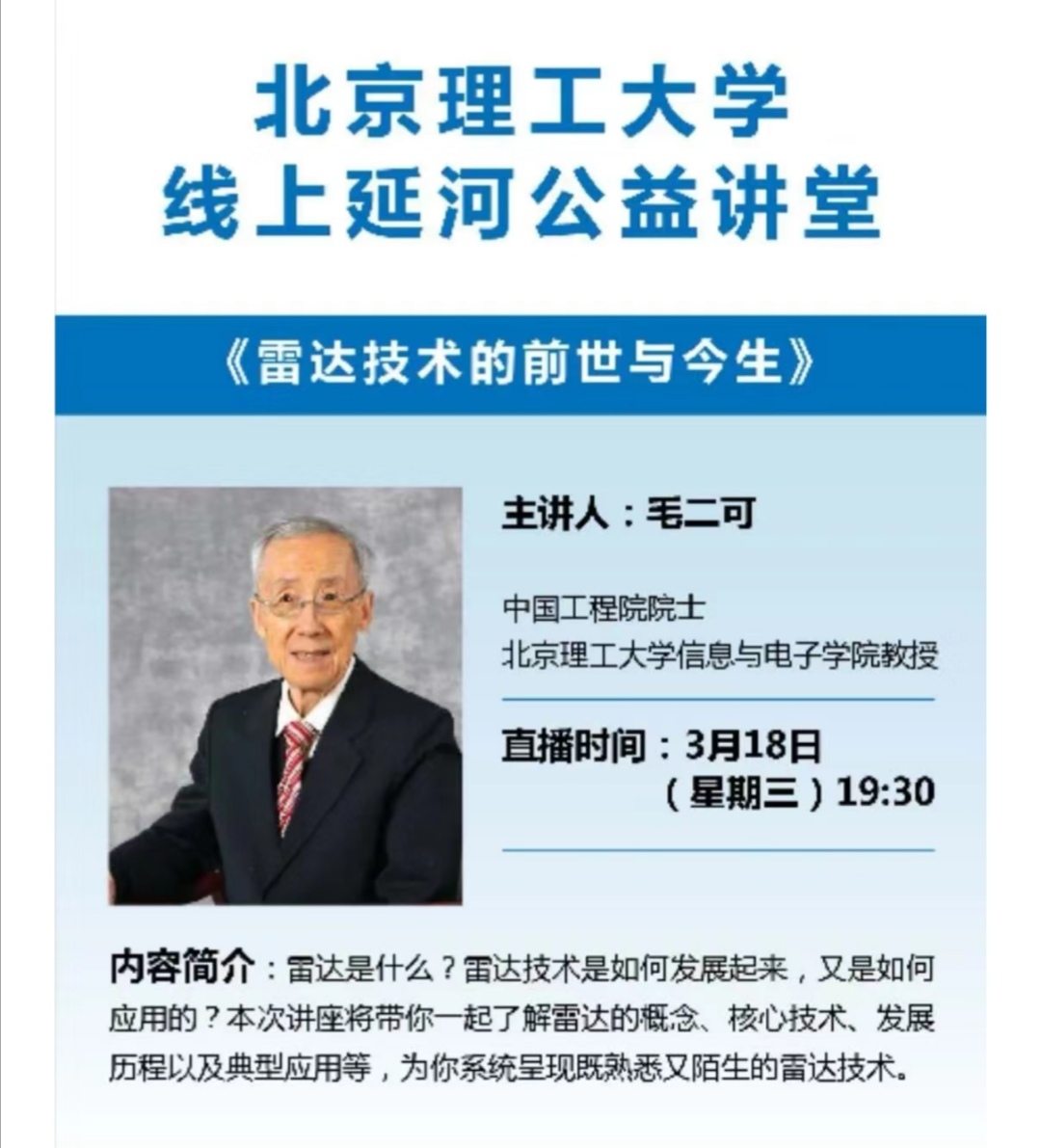 同時(shí),毛二可院士作為“北京理工大學(xué)線上延河公益講堂”主講人,借助Bilibili網(wǎng)站、抖音等平臺(tái)開展線上直播講座《雷達(dá)技術(shù)的前世與今生》。講座當(dāng)時(shí)僅Bilibili網(wǎng)站平臺(tái)就達(dá)到了6.8萬人觀看學(xué)習(xí)。毛二可院士踐行了一名人民教師和共產(chǎn)黨員的初心和使命,以實(shí)際行動(dòng)支持“抗疫”勝利的到來!