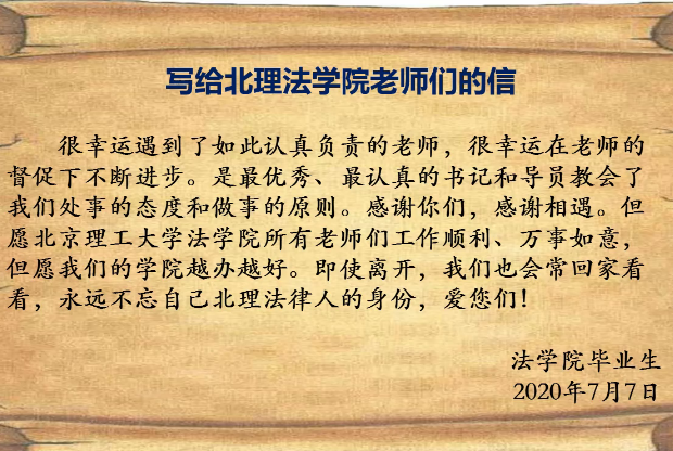畢業(yè)生吳雨霖代表全體畢業(yè)生朗讀了“寫給老師的一封信”,信中同學(xué)們回顧了求學(xué)北理工法學(xué)院的美好時(shí)光,感恩師長的諄諄教誨。畢業(yè)生還通過“畢業(yè)生云電臺”表達(dá)對學(xué)院、老師、同學(xué)們的依依不舍之情。法學(xué)院老師們、學(xué)弟、學(xué)妹們也在云上為畢業(yè)生送上祝福,祝他們前程似錦,再創(chuàng)輝煌,?;亍凹摇笨纯?。