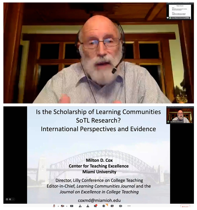 Milton Cox教授作了《學習社群的研究就是教與學學術研究嗎?——國際視野與證據(jù)》的大會報告。他認為,有三種相互關聯(lián)的學術研究:教與學的學術、專業(yè)發(fā)展的學術和學習社群的學術。學習社群的研究是高等教育的一個重要學術領域,但并非所有的學習社群研究都屬于教與學學術的范疇。