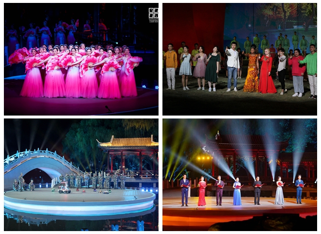 在絢爛多彩的屏幕緩緩降下時(shí),尾聲“創(chuàng)未來”從遠(yuǎn)處棧橋上北理工交響樂團(tuán)的演奏中徐徐展開,環(huán)北湖燈光亮起,各學(xué)院、書院代表英姿颯爽手舉院旗向觀眾席走來,八面北京理工大學(xué)校旗在眾人簇?fù)硐?,飄揚(yáng)在絢麗的舞臺(tái)上。北湖畔的樹林中、山坡上、拱橋邊、廊亭下,數(shù)千名北理工師生佇立其間共唱校歌,將晚會(huì)推向高潮。在全體演職人員嘹亮的《歌唱祖國》聲中,晚會(huì)圓滿結(jié)束。