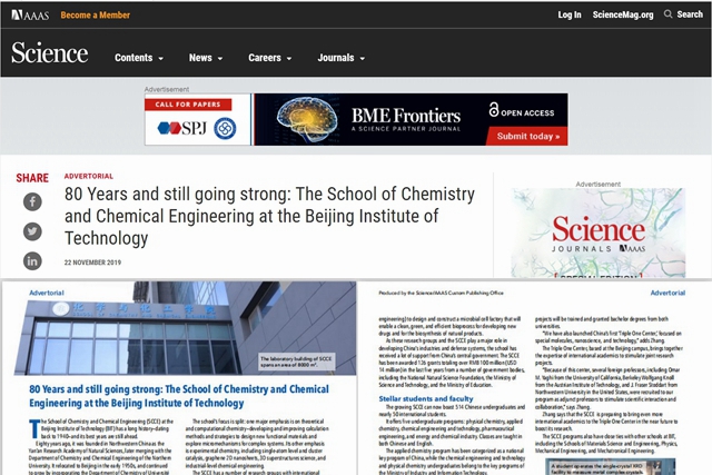11月22日,《Science》在其Advertorials欄目專題報道了北理工化學(xué)與化工學(xué)院發(fā)展建設(shè),詳細(xì)介紹了學(xué)院的學(xué)科布局與發(fā)展...
